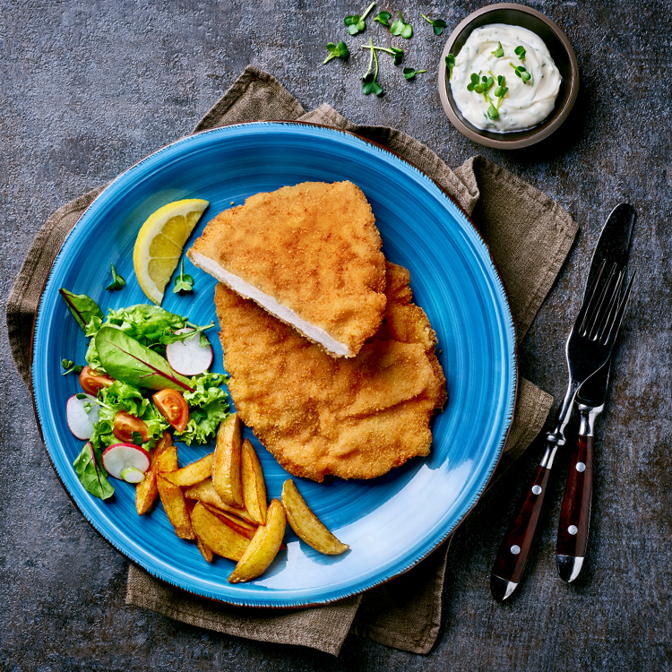 aus dem Schweinelachs geschnitten, mit 8 % Flüssigwürzung, paniert, tiefgefroren