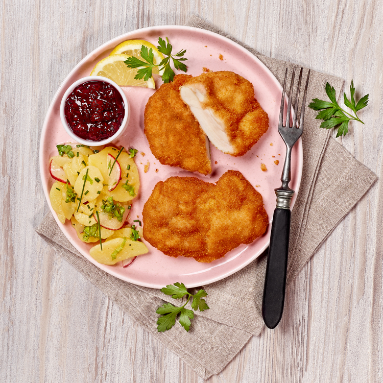 aus der Hähnchenkeule geschnitten, mit Semmelbröselpanade paniert, vorgebraten, tiefgefroren